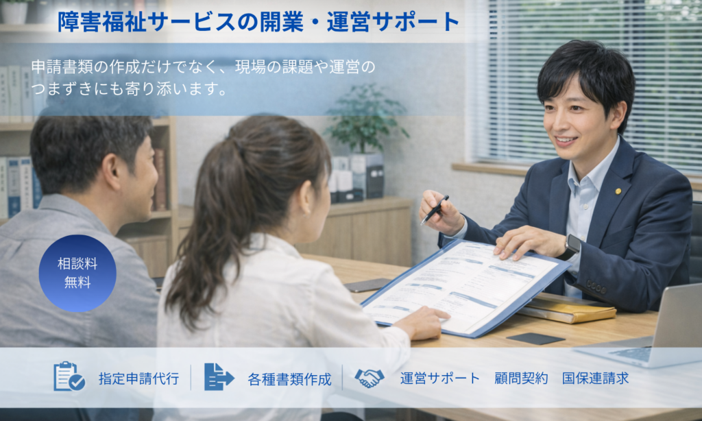 当事務所は、障がい福祉分野に特化し、指定申請・運営サポート・加算や指導対応など、事業者さまが安心して事業を続けられるようにサポートしております。